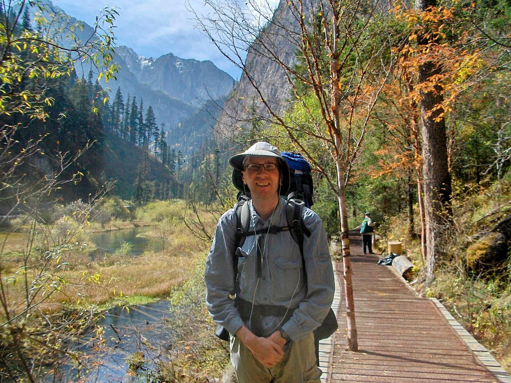 Anyway, the photo is of me looking like a goofball on one of the Jiuzhaigou trails. I’ve been here for two days, after an 11-hour bus trip from Chengdu. The bus trip was a little nicer than four years ago. The bus was air-conditioned and had decent ventilation. I was seated near the front, and the only ones on the bus who seemed to be smoking were the driver and conductor. They even held it down to one per hour, until the last hour when the driver started chain smoking during the toe-curling descent from 3000m to 1800m.